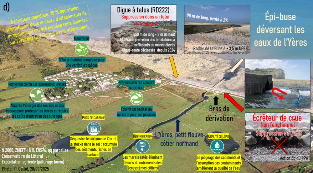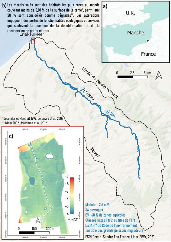 La basse vallée de l’Yères, située en Seine-Maritime, est caractérisée par des prairies humides sub-halophiles classées Natura 2000, liées à la construction historique d’une digue route isolant la zone avale du fleuve de la frange littorale. La digue-route littorale, ainsi qu’une buse servant d'exutoire de l’Yères, sont aujourd’hui en mauvais état, engendrant une efficacité faible en matière de protection contre les submersions marines et d’évacuation des crues. La buse est de plus non conforme en matière de continuité écologique. Un projet de réouverture de la basse vallée à la mer est donc à l’étude, porté par le Syndicat Mixte Littoral de Seine-Maritime en partenariat avec d’autres acteurs (AESN, SBVY, CCVS, commune de Criel-sur-Mer). La mise en transparence de l’ouvrage est prévue pour 2030. À l’initiative de l’OFB, une réflexion a été lancée début 2023 sur l’intérêt et la faisabilité de définir un protocole de Suivi Scientifique Minimum (SSM) inspiré des projets existants pour les milieux aquatiques continentaux et adapté au cas spécifique des opérations de ré-estuarisations.